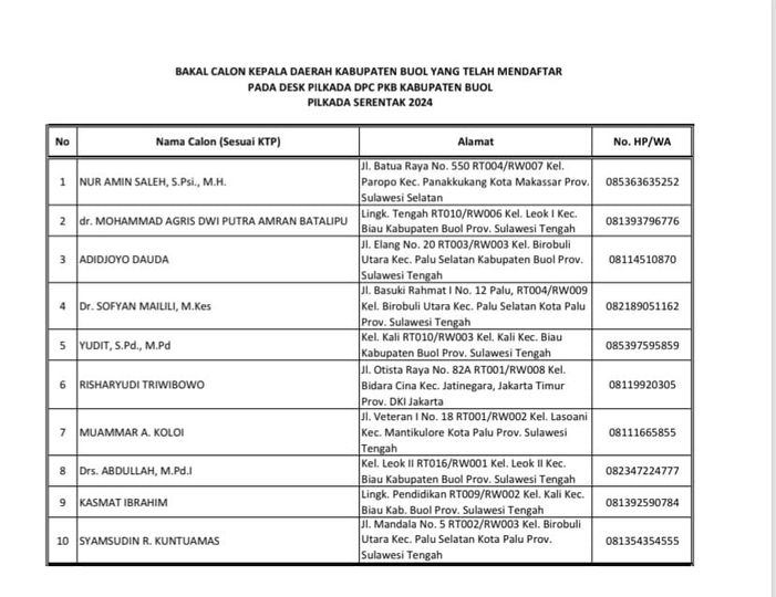 Sejak dibuka pendaftaran calon Bupati oleh Desk Pilkada Buol Tahun 2024 DPC PKB, sudah ada 11 kandidat mengambil formulir pendaftaran sebagai wujud keseriusan maju di Pilkada nanti.