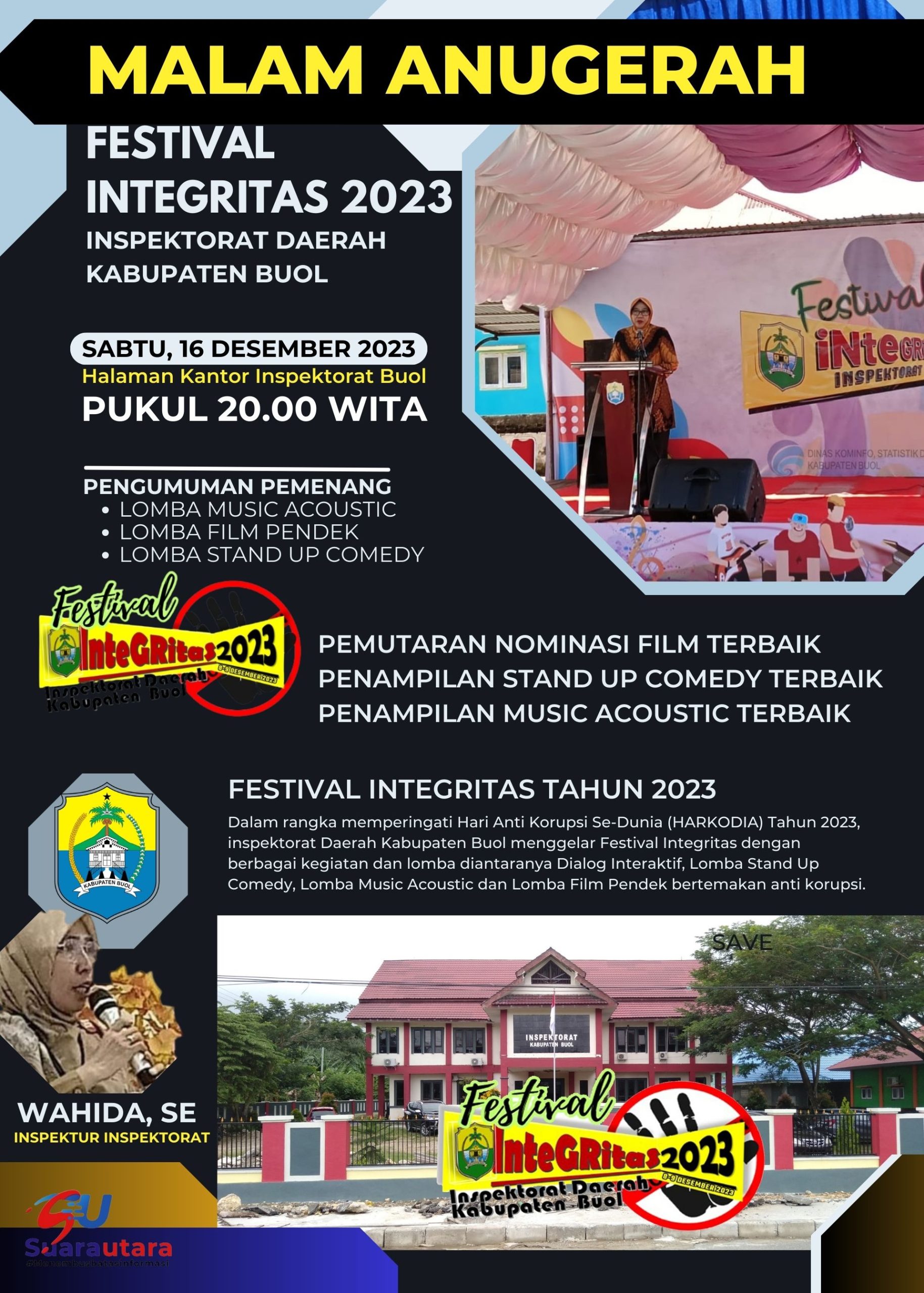 SUARAUTARA.COM, BUOL – Inspektorat Daerah Kabupaten Buol, Sulawesi Tengah (Sulteng) menggelar iven bertajuk Festival Integritas Tahun 2023 memperingati Hari Anti Korupsi Sedunia (Harkodia), bertempat di halaman Kantor Inspektorat daerah, Jum’at 15 hingga Sabtu, 16 Desember 2023.