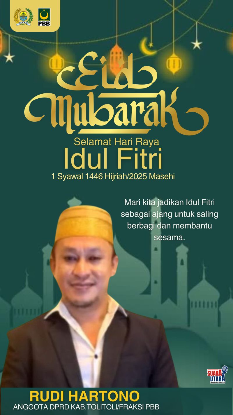 Tolitoli, Suarautara.com – Anggota DPRD Kabupaten Tolitoli, Sulawesi Tengah (Sulteng), Rudi Hartono dari Fraksi PBB mengucapkan selamat hari raya Idul Fitri 1 syaqal 1446 Hijriah/ 2025 Masehi.