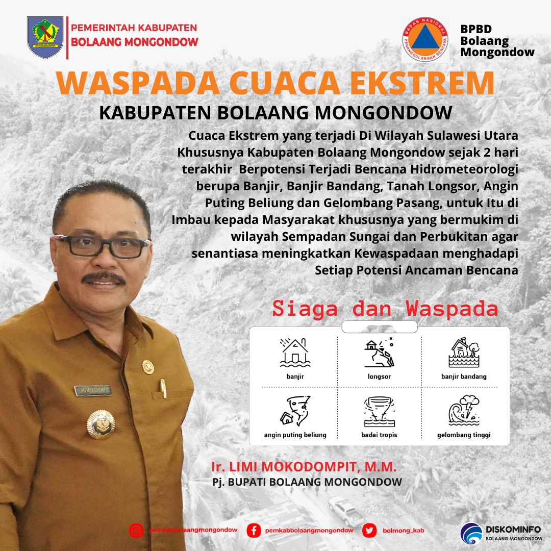 Penjabat Bupati Bolmong Ir Limi Mokodompit MM melalui Kepala Badan Penanggulangan Bencana Daerah (BPBD) Bolmong Syahril Mokoagow menyampaikan, cuaca ekstrem yang terjadi di wilayah Sulut khususnya wilayah Bolmong, sejak dua hari terakhir berpotensi terjadi bencana Hidrometeorologi.