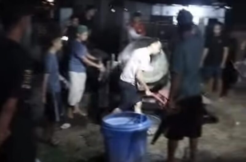 Dipimpin langsung Kepala Desa Hulubalang, Arlan L. Amalu, warga bergotong royong melakukan pengecoran teras Masjid Nurul Ain, usai Salat Tarawih, Jumat (27/2/2026) sekitar pukul 23.30 WITA.