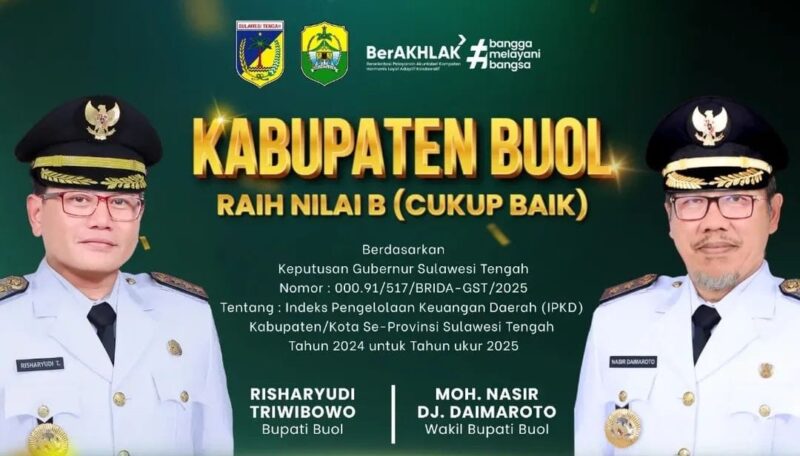 BUOL – Pemerintah Kabupaten Buol kembali menorehkan capaian positif dalam pengelolaan keuangan daerah. Berdasarkan hasil penilaian Indeks Pengelolaan Keuangan Daerah (IPKD) Tahun 2024 untuk tahun ukur 2025, Kabupaten Buol berhasil meraih nilai 69,27 dengan predikat B (Cukup Baik).