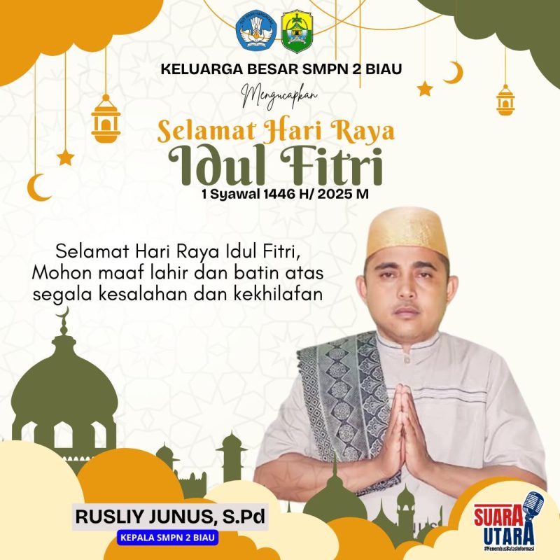 SUARAUTARA.COM – Keluarga besar Sekolah Menengah Pertama (SMP) Negeri 2 Biau Kabupaten Buol, Sulwesi Tengah Mengucapkan selamat hari raya idul fitri 1 syawal 1446 Hijriah/ 2025 Masehi