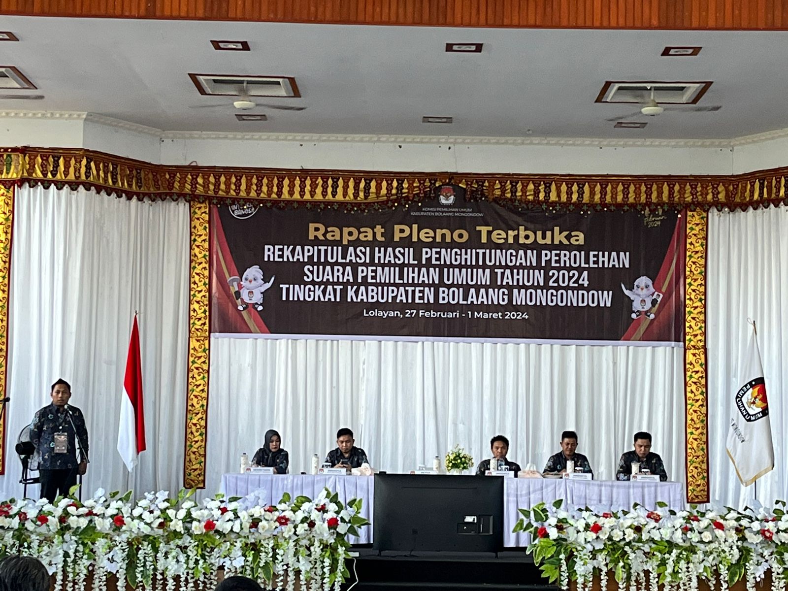 Rapat pleno yang diikuti sejumlah saksi parpol peserta Pemilu. Pantauan di lapangan, proses rekapitulasi hasil penghitungan perolehan suara hasil Pemilu 2024 tingkat Kabupaten ini, dilakukan secara satu persatu atau laporan yang dibacakan per Kecamatan. Rapat pleno terbuka itu dipimpin langsung Ketua KPU Bolmong Afif Zuhri, yang di hadiri lengkap 4 Komisioner dan Kepala Sekretariat KPU.
