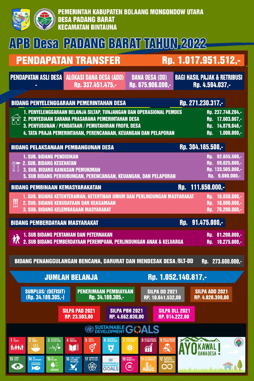 Adapun LPJ APBDesa Desa Padang Barat Kecamatan Bintauna Kabupaten Bolaang Mongondow Utara, telah kami sampaikan seperti dokumen terlampir, agar masyarakat dapat mengetahui tentang informasi pelaksanaan anggaran Pemerintahan di Desa Padang Barat. terlampir gamabr dibawah Laporan Realisasi APBDES Desa Padang Barat Tahun 2021.