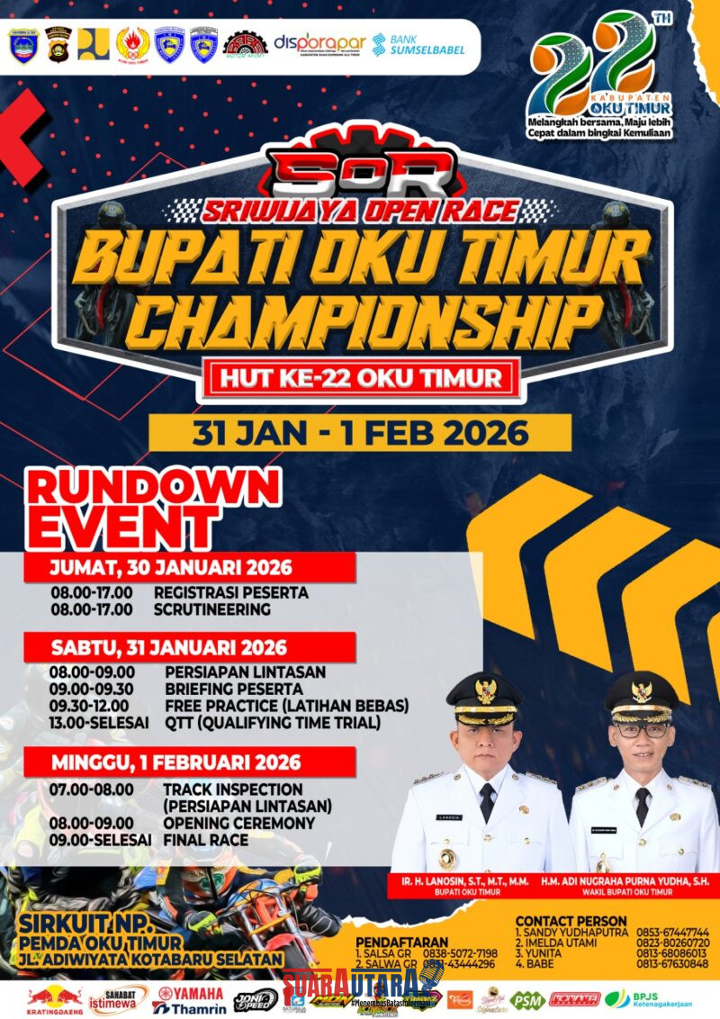 Suarautara. com, Buol – Dalam rangka memeriahkan Hari Ulang Tahun (HUT) ke-22 Kabupaten OKU Timur, Pemerintah Kabupaten OKU Timur akan menggelar Open Road Race Bupati OKU Timur Championship 2026. Event balap bergengsi ini dijadwalkan berlangsung pada 31 Januari–1 Februari 2026 di Sirkuit NP Pemda OKU Timur, Jalan Adiwiyata, Kotabaru Selatan.