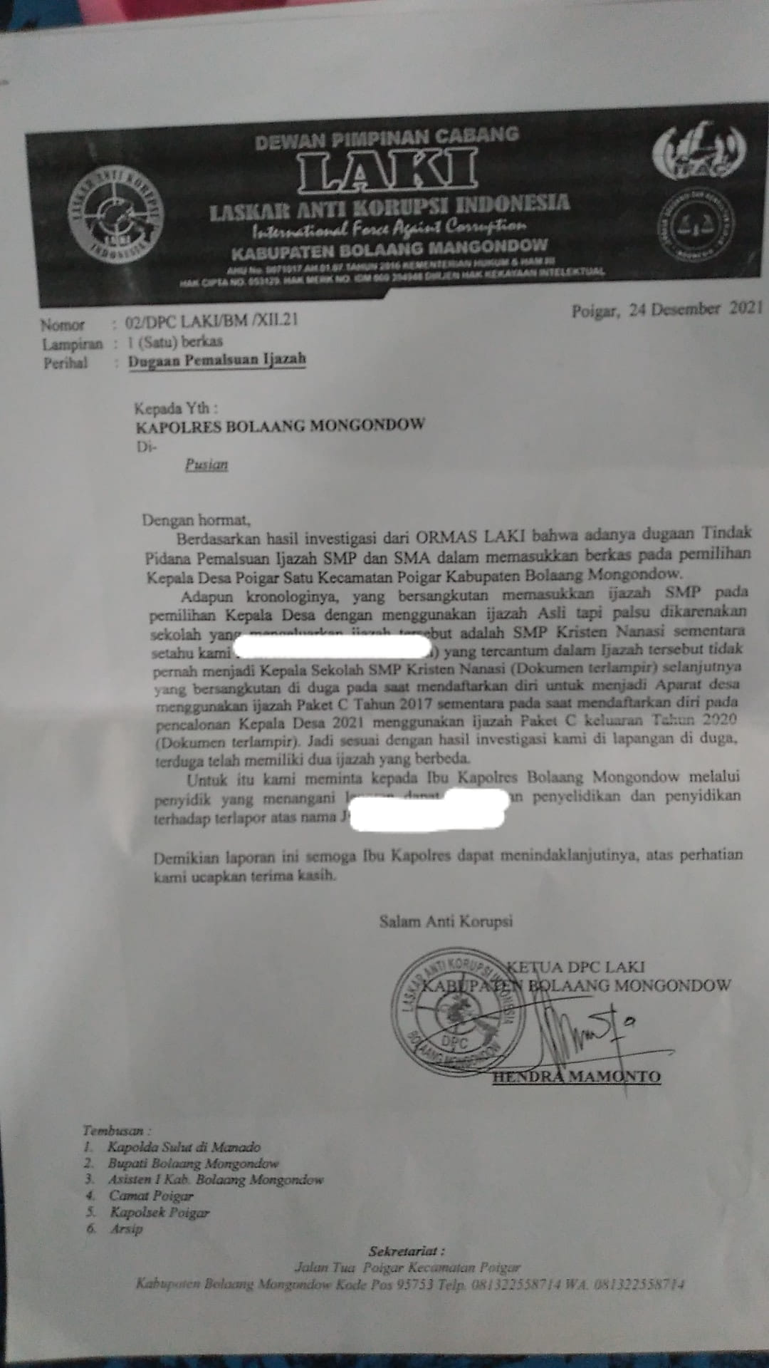 Laporan DPC LAKI Bolmong tersebut dituangkan dalam Laporan pengaduan resmi Nomor.02/DPC-LAKI/BM/XXll.21, terkait dugaan tindak pidana murni pemalsuan Ijazah saat melakukan pendaftaran dan penyerahan dokumen ke Panitia Pilsang desa Poigar Satu Kecamatan Poigar Kabupaten Bolmong.