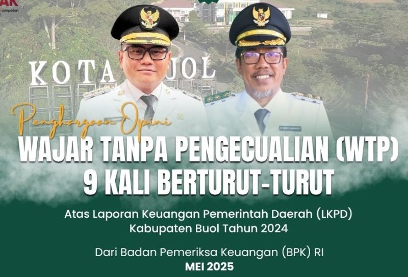 PALU, Suarautara.com – Pemerintah Daerah Kabupaten Buol kembali meraih opini Wajar Tanpa Pengecualian (WTP) atas Laporan Keuangan Pemerintah Daerah (LKPD) Tahun Anggaran 2024 dari Badan Pemeriksa Keuangan (BPK) Perwakilan Provinsi Sulawesi Tengah.