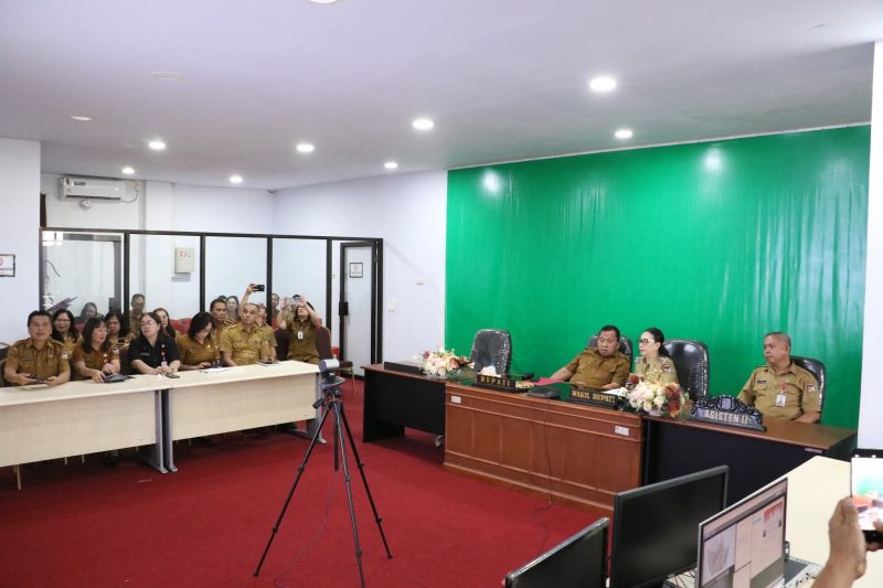 Bupati Minahasa Robby Dondokambey, S.Si., M.AP., bersama Wakil Bupati Vanda Sarundajang, S.S., mengikuti jalannya rapat dari Ruang Command Center Kantor Bupati Minahasa.