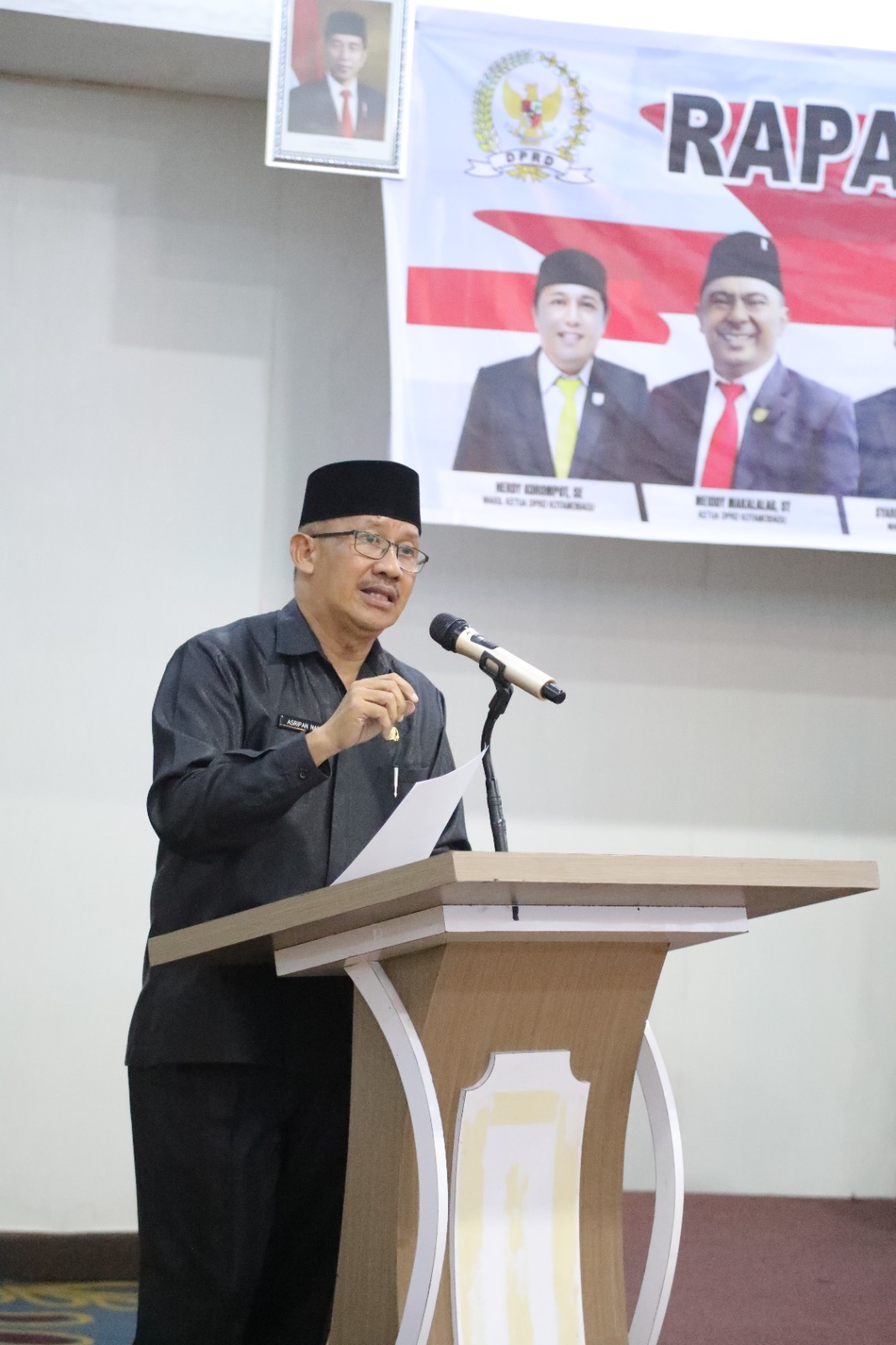 Kotamobagu—Penjabat Wali Kota Kotamobagu, Dr. Drs. Hi. Asripan Nani, M.Si, menghadiri rapat paripurna Dewan Perwakilan Rakyat Daerah (DPRD) Kota Kotamobagu.