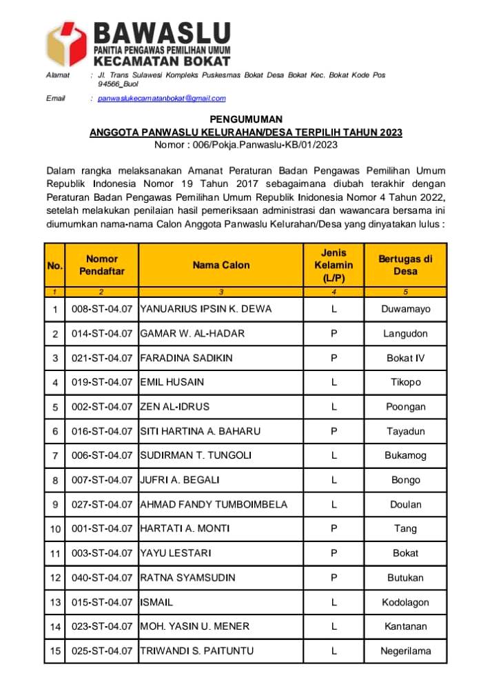 Buol – Panitia Pengawas Pemilihan Umum (Panwaslu) Kecamatan Bokat telah menetapkan 15 Panwaslu Kelurahan/Desa (PKD) yang dinyatakan lulus proses seleksi, Sabtu (4/2) hari ini.