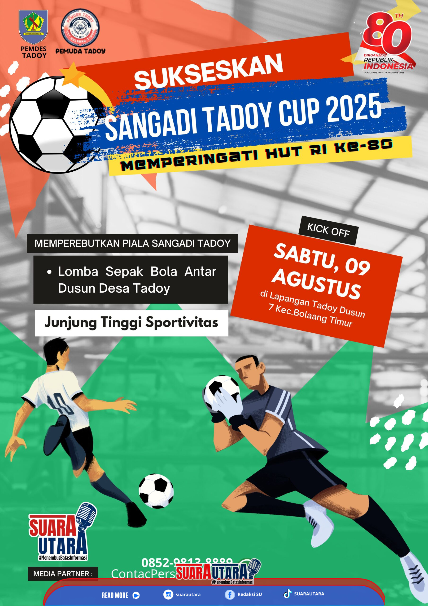 Turnamen yang memperebutkan Piala Sangadi Tadoy ini akan diikuti oleh tim-tim perwakilan dari masing-masing dusun di Desa Tadoy, Kecamatan Bolaang Timur. Kick-off perdana digelar pada Sabtu (9/8/2025) sore ini di Lapangan Olahraga Desa Tadoy, dan dihadiri oleh Camat Bolaang Timur serta Sangadi Tadoy sebagai tanda dimulainya turnamen.