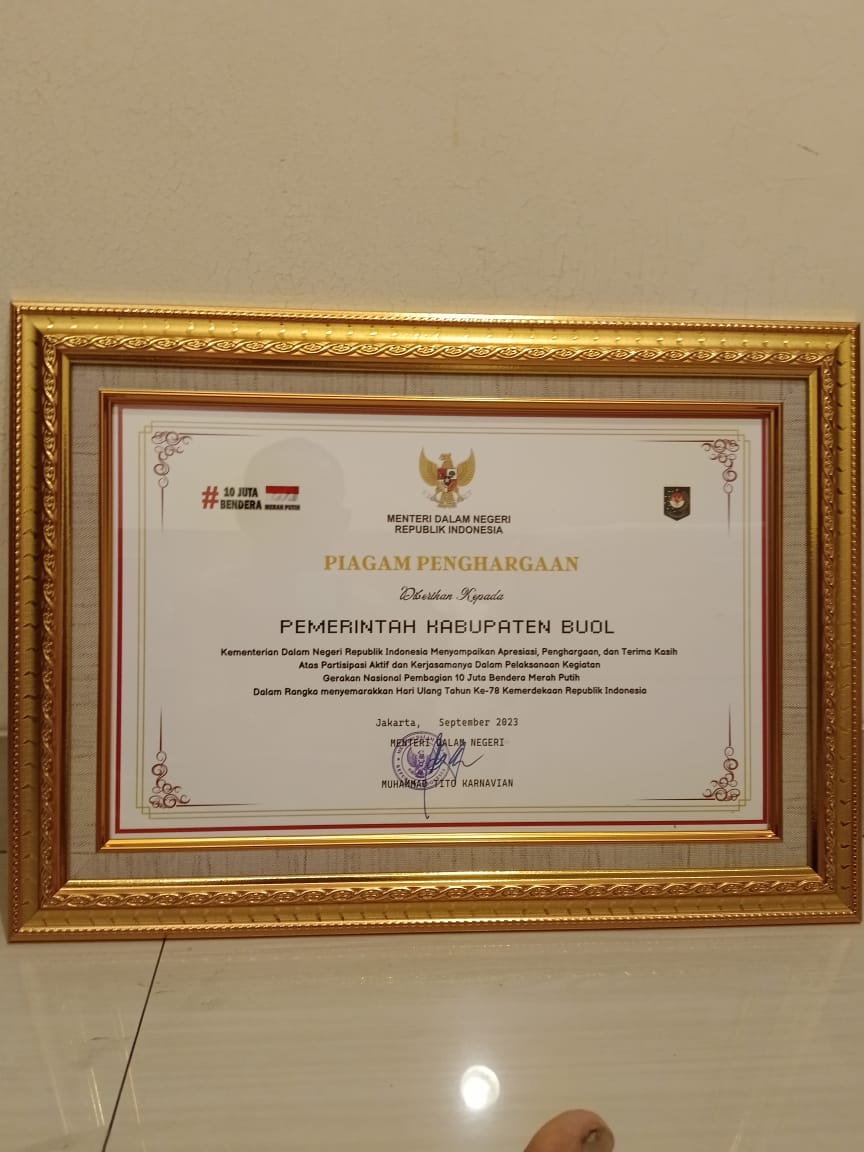 Satu-Satunya di Sulteng, Buol Terima Penghargaan Gerakan  Nasional Pembagian 10 Juta Bendera