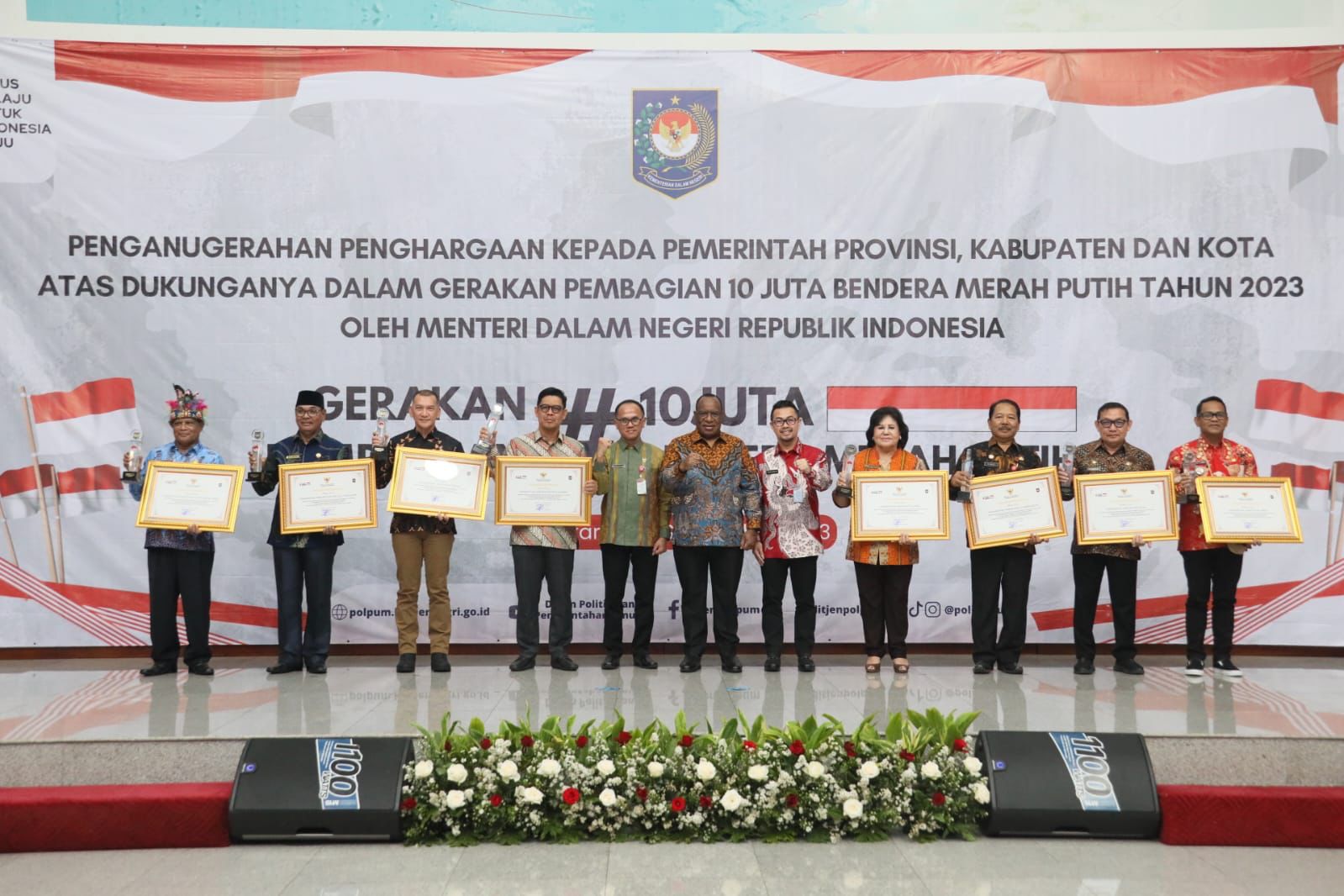 Penganugerahan Penghargaan kepada Pemerintah Provinsi, Kabupaten/Kota atas dukungannya dalam gerakan pembagian 10 Juta bendera Merah Putih Tahun 2023 bertempat di Ruang Sasana Bhakti Praja Gedung C Lantai 3, Kemendagri, Jakarta (uchan)