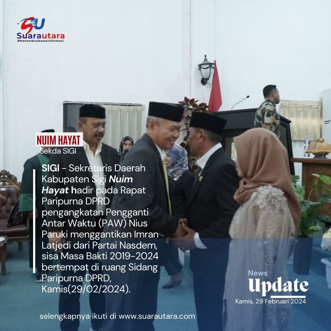 SIGI – Sekretaris Daerah Kabupaten Sigi Nuim Hayat hadir dalam Rapat Paripurna DPRD terkait pengangkatan Pengganti Antarwaktu Masa (PAW) Nius Paruki menggantikan Imran Latjedi dari Partai Nasdem, sisa massa bakti 2019-2024, bertempat di ruang sidang DPRD Jl Dayo Savi, Kotarindu, Kecamatan Dolo, SIGI, Kamis(29/02/2024).