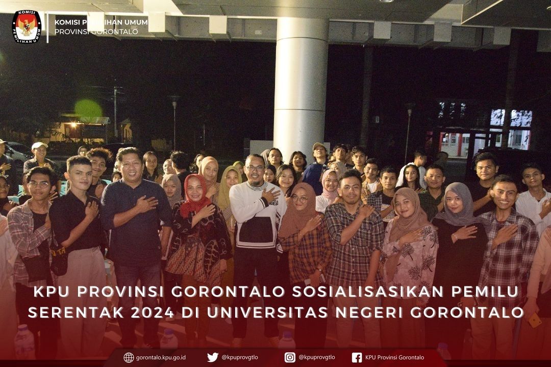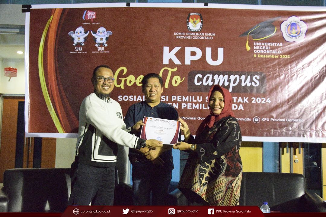 Program KPU Goes to Campus menjadi salah satu kegiatan pendidikan pemilih sekaligus sosialisasi yang dilakukan oleh Komisi Pemilihan Umum (KPU) Provinsi Gorontalo. Sasaran dari kegiatan ini adalah peningkatan awareness khususnya di kalangan mahasiswa terhadap Pemilu, Penyelenggara Pemilu, dan Politik secara umum.