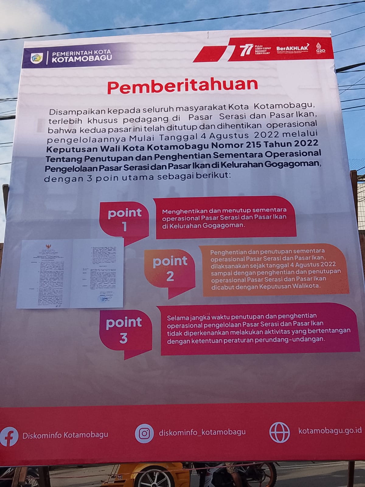 Kotamobagu, – Tiga poin Penutupan dan penghentian sementara operasional Pasar Serasi Bukan Terkait Sengketa Kepemilikan Lahan. Pemberitahuan di sampaikan kepada seluruh masyarakat kota Kotamobagu…