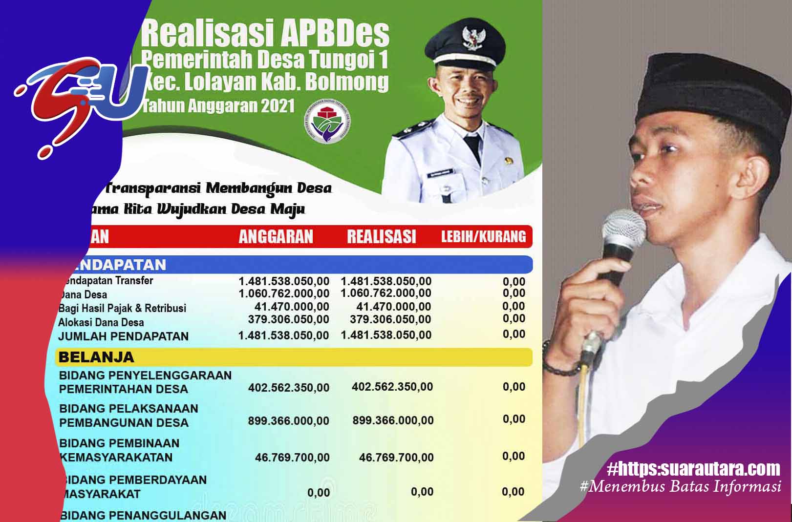 Bolmong – Pemerintah Desa (Pemdes) Tungoi 1, Kecamatan Lolayan, Kabupaten Bolaang Mongondow, Sulawesi Utara mempublikasikan Realisasi Anggaran Pendapatan Belanja Desa (APBDes) tahun 2021 melalui…