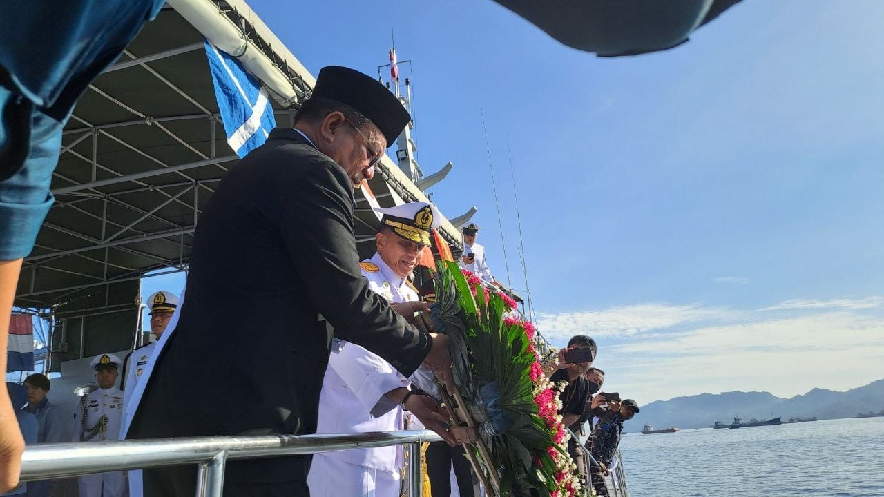 Bertolak dari Dermaga Samuel Languyu Satrol Lantamal VIII Kota Bitung menuju lokasi upacara di perairan depan Trikora, upacara ditandai dengan pelarungan karangan bunga oleh Wali kota Bitung selaku Inspektur Upacara diikuti tabur bunga oleh para undangan.